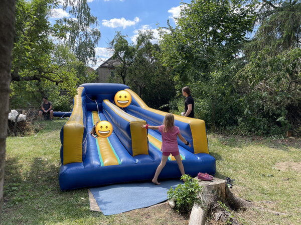 Der Pfarrgarten bot in diesem Jahr genug Platz, um das Bungeerun vom Frizz Seelow und die Hüpfburg von der Allianz Lars Busse aufzustellen.
